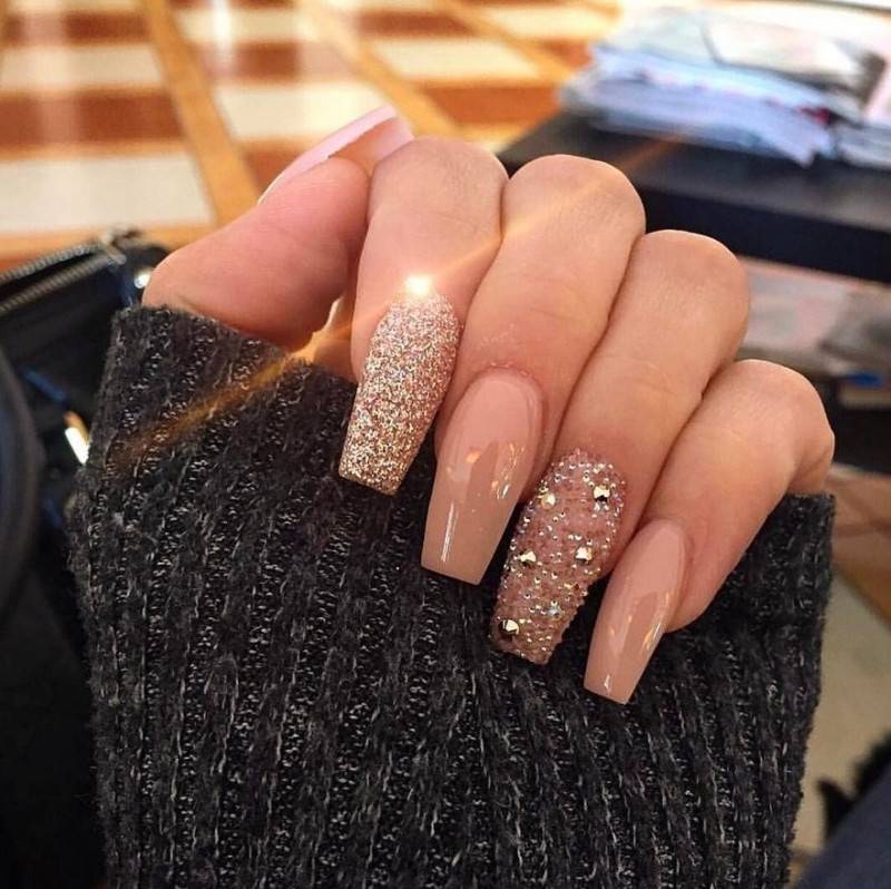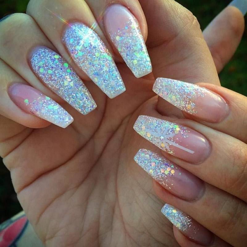 Блёстки и глиттер идеально подходят для украшения длинных ноготков, причём в этом случае допускается оформление с дополнительным декором, стразами, рисунками, в матовом и глянцевом исполнении.