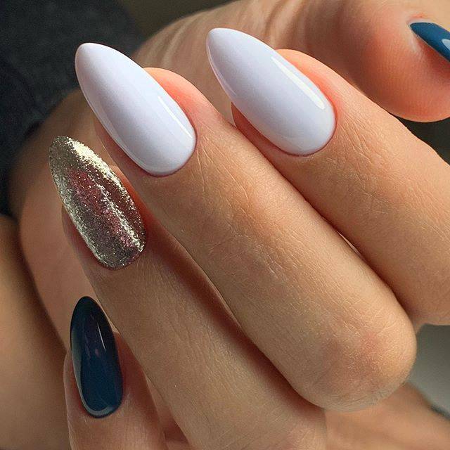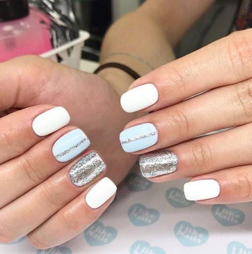 - Классическое сочетание – белый шиммер плюс лак любого цвета, например синий или красный