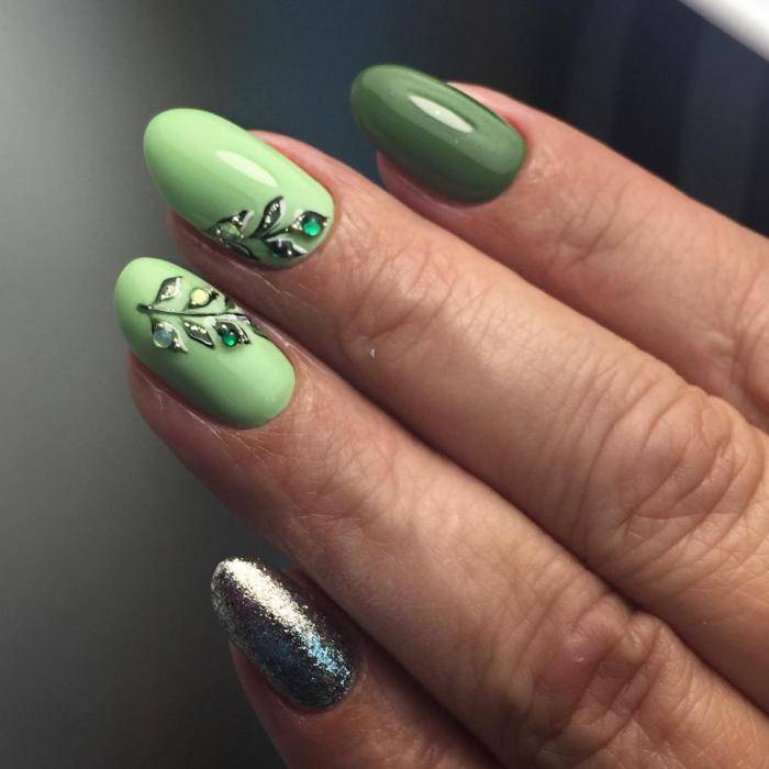 Добиться мерцающего эффекта возможно и за счет декорирования ноготков с помощью страз или фольги, комбинируя их с глиттером, а также сочетая с матовым и глянцевым покрытием.