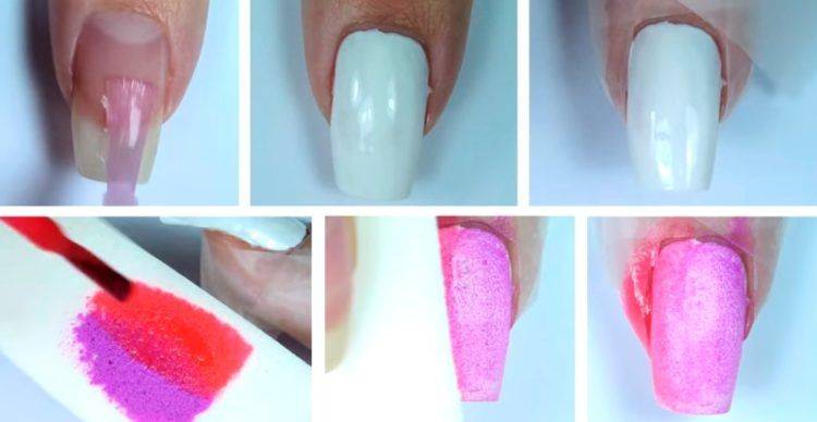 Первым делом выполняют стандартный уход, отодвигая кутикулу и придавая форму ногтям. Далее действуют так: