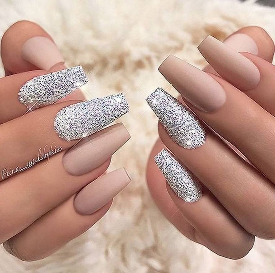 Матовый маникюр с глиттером выглядит изысканно и элегантно, поэтому его выбирают женщины, которые хотят поразить шикарностью образа.