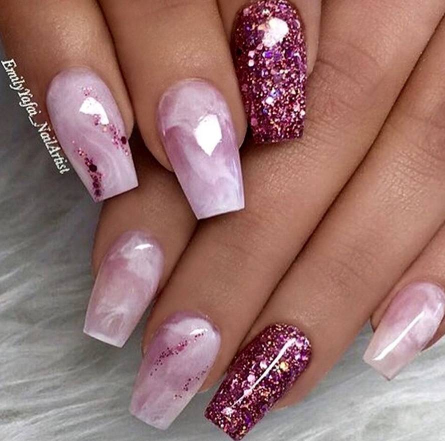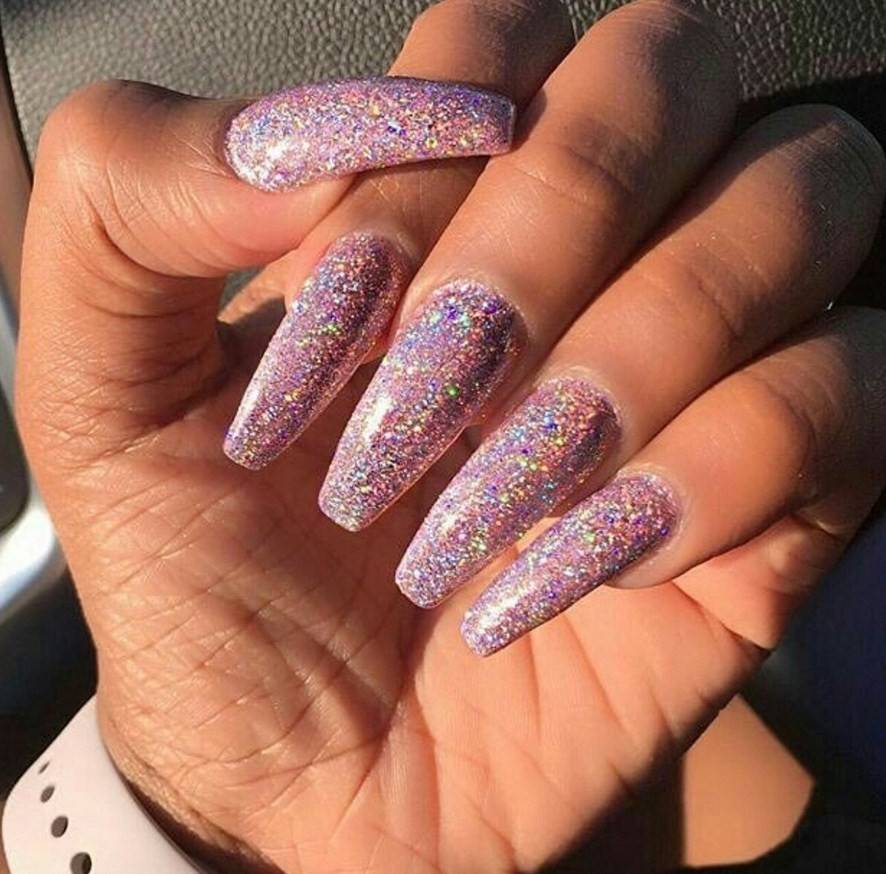 Блёстки и глиттер идеально подходят для украшения длинных ноготков, причём в этом случае допускается оформление с дополнительным декором, стразами, рисунками, в матовом и глянцевом исполнении.