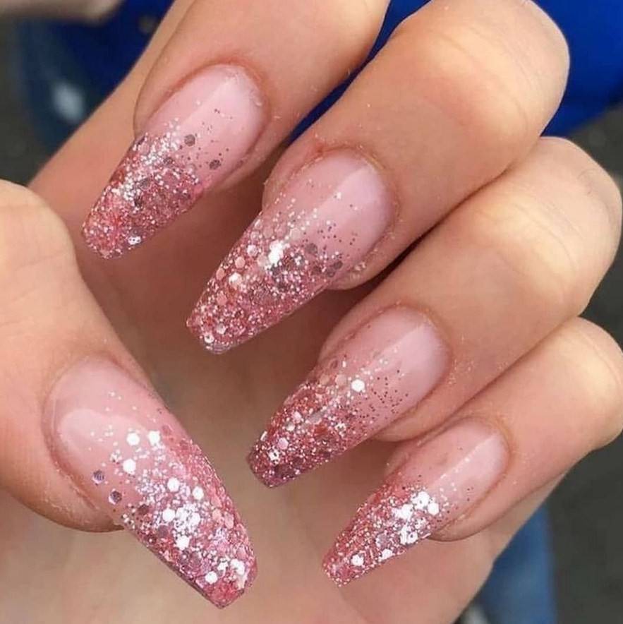 1. Градиентный эффект. Создайте градиентный эффект, нанеся глиттер на ногти разной интенсивности. Начните с яркого и насыщенного цвета у основания ногтя, постепенно переходя к светлому и блестящему глиттеру к кончику ногтя.