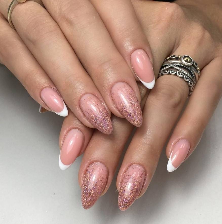Сверкающими частицами можно украшать все ногти, выделять 1-2 пластины целиком или выполнить френч, омбре, лунный дизайн.
