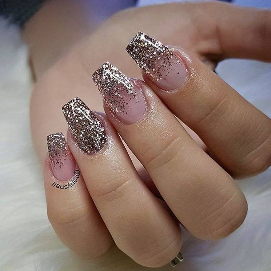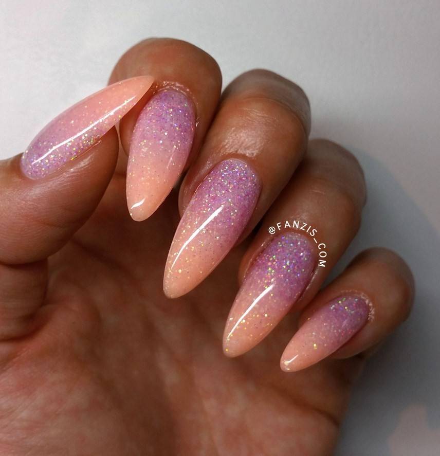 Градиент на ногтях можно выполнить двумя способами: нанести прозрачные блестки на цветное покрытие либо использовать цветной глиттер. Варианты маникюра с глиттером смотрите на фото.