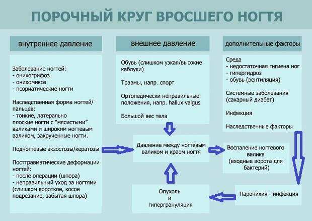 Ногтевая пластина не растёт в ширину, и врастание ногтя возникает исключительно из-за воспаления околоногтевого валика. В процессе развития болезни мягкие ткани околоногтевого валика травмируются об острый край ногтевой пластины. Начинается воспалительный процесс с отёком мягких тканей, из-за которого они ещё больше вдавливаются в ноготь. В результате постоянной травматизации начинает разрастаться грануляционная ткань (довольно мягкая и пористая, воспринимаемая незнающим человеком как «лишняя кожа»). Постепенно отёк и воспаление нарастают, всё больше причиняя дискомфорт. Присоединяется грибковая и бактериальная среда, возникает изменение цвета пораженного околоногтевого валика, локальное повышение температуры и выделение гноя. Носить привычную обувь становится практически невозможно, попытки опереться на больной палец вызывают острую боль. Далее воспалительный процесс приобретает хроническое течение, грануляционная ткань уплотняется, ногтевая пластинка деформируется, и воспаление может распространиться на костную ткань .