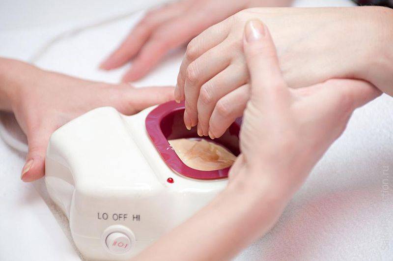 - Парафинотерапию. Разогретое вещество с маслами макадамии и миндаля наносят на руки, одевают рукавички и держат четверть часа. Эта операция стимулирует крообращение, увеличивает приток кислорода к ногтевой пластине.