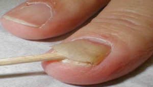 - химический — с использованием кератолитических средств (чаще всего 15% сернистый барий на тальке), весь процесс может занять более 10 дней, так как предполагает послойное размягчение и очистку ногтевых тканей;