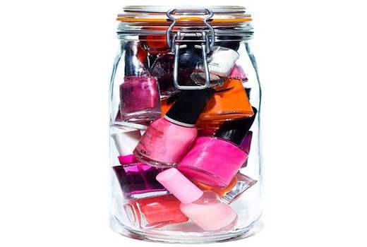 В качестве емкости для хранения лаков подойдет стеклянная банка, оставшаяся от конфет или других вкусностей. Хорошим решением станет и пустая банка для круп. Плотно закрытая крышкой, она будет отлично выглядеть на женском трюмо и поможет сохранить лаки свежими дольше.