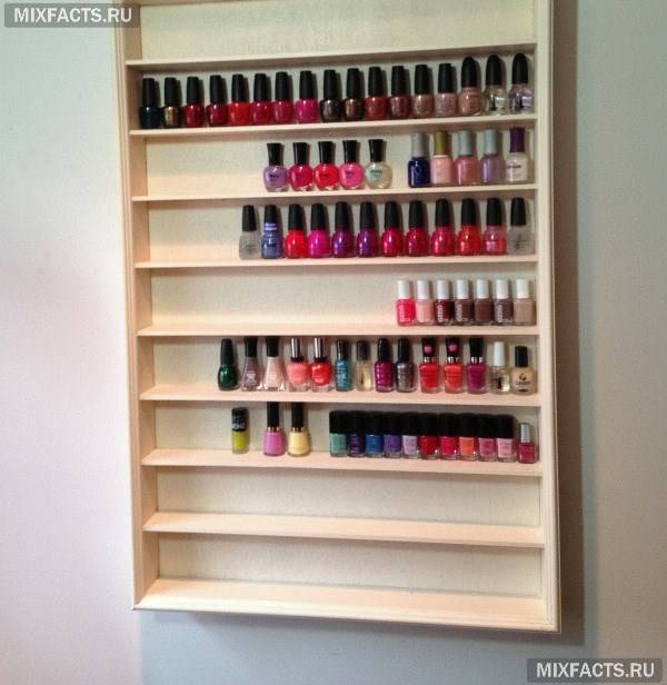 Комоды и витрины довольно громоздкие, и занимают они достаточно много места, поэтому их не очень удобно использовать в домашних условиях. Если у вас большая коллекция лаков для ногтей, которую негде хранить, используйте альтернативный вариант. Узкие полочки, зафиксированные на стене, не займут много места, а любимые флакончики будут всегда под рукой. Подставка является универсальной, поэтому ее можно запросто купить в магазине или соорудить самостоятельно.