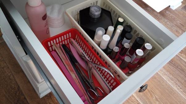 Под хранилище для лаков удобно будет приспособить прямоугольные пластиковые контейнеры с крышкой, продающиеся в хозяйственных магазинах. Там же можно найти прозрачные боксы для обуви или комоды с несколькими выдвижными ящиками.