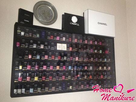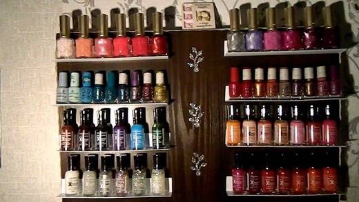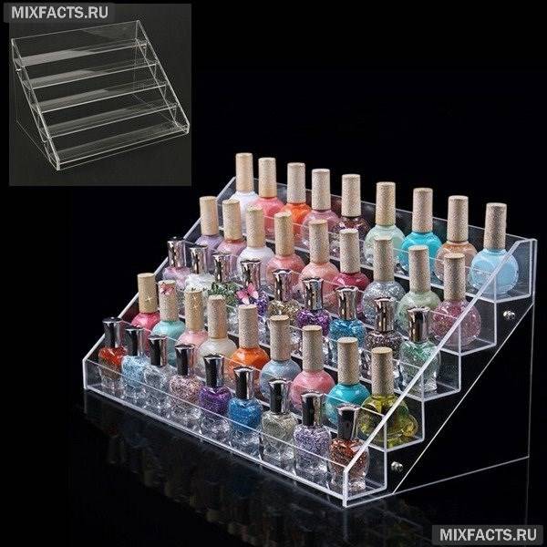 Для девушек, накопивших достаточно большую коллекцию ярких флаконов, можно предложить дисплей или многоуровневые полочки. Подставка содержит несколько ярусов, благодаря чему все лаки будут как на ладони. Полочки могут располагаться ступенчато или же на одном уровне.