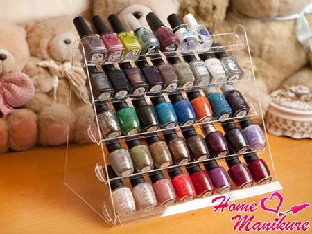 Аксессуары, о которых далее пойдет речь, чаще встречаются в салонах и в специализированных магазинах, где объем флаконов очень велик. При желании, конечно, их можно приобрести и в личное пользование. Настольный или напольный комод, а также витрина с прозрачными выдвижными ящиками способны вместить в себя огромное количество бутылочек. Все лаки располагаются в ряд, поэтому при необходимости можно сразу найти подходящий цвет.