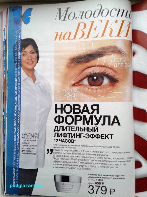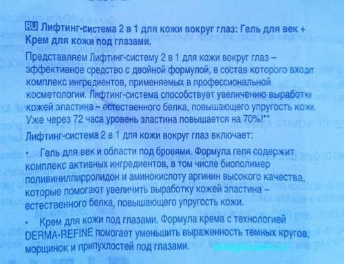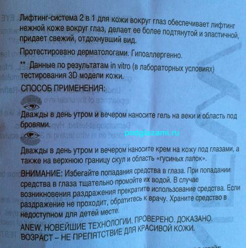 Основной фишкой крема является его двойственность: то есть, в банке 2 отделения: над глазами мы мажем гель, а под глазами — крем. Из-за этих манипуляций, как утверждает реклама в журнале, кожа подтянется и станет ого-го!