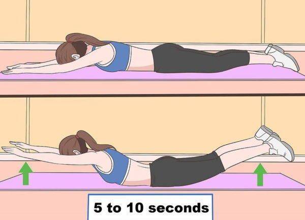 Шаг 2. Следующее упражнение – мостик наоборот. Он хорошо прорабатывает поясницу и рекомендуется для профилактики появления болевого синдрома в этой области. Чтобы его сделать, нужно лечь на живот, вытянуть вперед руки и ноги назад, слегка согнув колени. Далее требуется поднять вверх конечности, отрывая их от пола. В верхней позиции нужно задержаться на 5-10 секунд, а затем расслабиться и опустить конечности на пол. Требуется сделать 10 повторов.