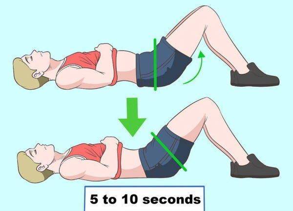 Шаг 3. Чтобы сделать следующее упражнение, нужно лечь на спину и поставить ноги на стопы. После этого нужно напрягать бедра и поясницу так, чтобы появлялся небольшой зазор между полом и поясницей. Выполняется 10-20 повторов.