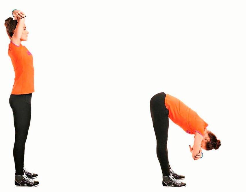 Наклоны корпуса вперед. Правильная техника наклонов заключается в сгибании туловища в тазобедренном суставе. Поясница при этом должна сохранять естественный прогиб! Руки можно завести за голову взяв в замок, либо вытянуть вперед, как в предыдущем упражнении. Это увеличит нагрузку на мышцы спины.
