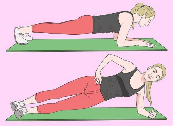 Шаг 6. Боковая планка поможет прокачать мышцы живота, боковой пресс, поясницу. Делать ее нужно так – требуется лечь на бок с упором на локоть нижней руки. Далее поднять поясницу и зафиксировать ее на весу так, чтобы сформировать телом ровную линию. Также планка может выполняться обычная – для этого следует повернуться лицом к полу и опереться на локти и пальцы ног, а затем поднять тело, чтобы образовать ровную линию.