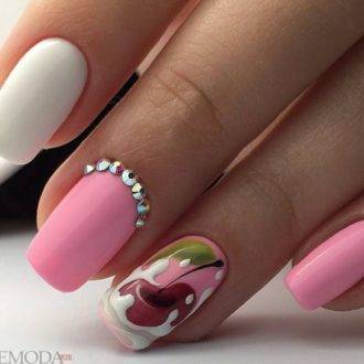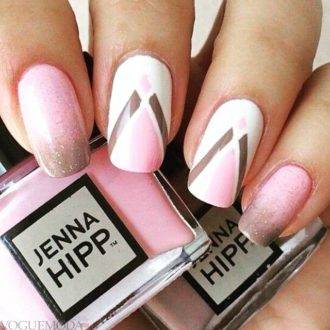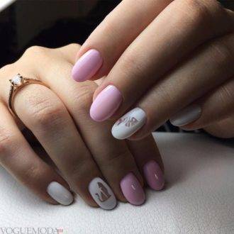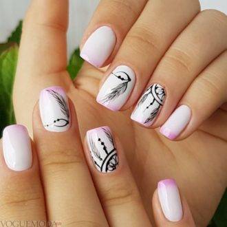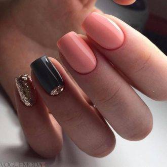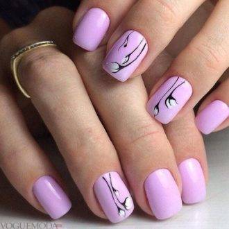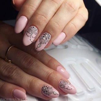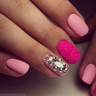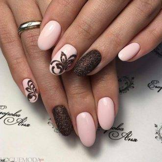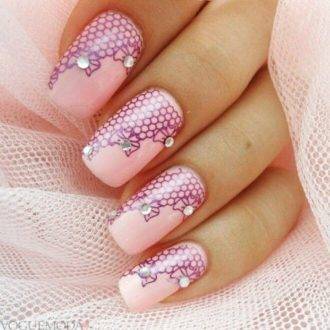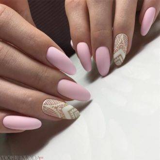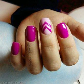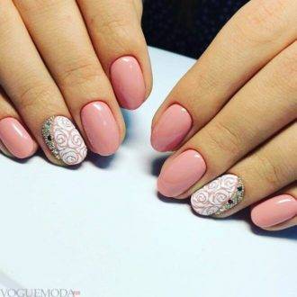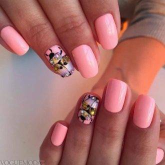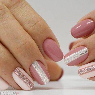 Розовый, впрочем так же как и бежевый, является универсальным цветом для повседневного маникюра. Он незаменим для оформления коротких ногтей, т.к. светлые оттенки зрительно удлиняют ногти. Розовый – цвет весны и лета. От сочетается с цветочными орнаментами и вензелями. При желании можно сделать и геометрический рисунок, например выложить его фольгой “битое стекло”, она очень стильно смотрится на розовом гель-лаке.