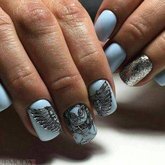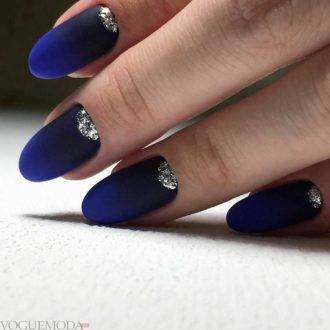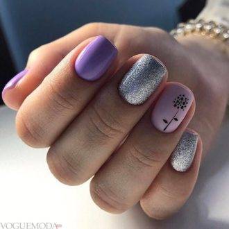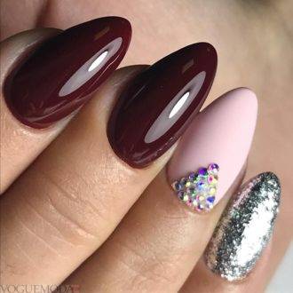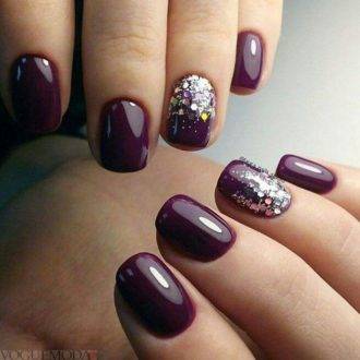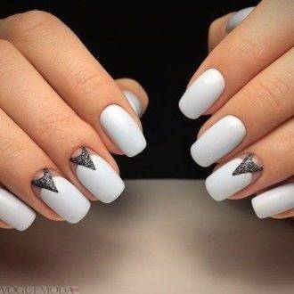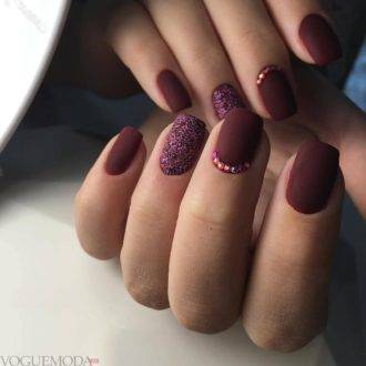Матовый и фактурный гель-лак будут представлены как элементы декора или в качестве покрытия на двух-трех ногтях. Роскошный эффект с элементами гламура может быть достигнут при использовании «сверкающих» элементов отделки. Ими могут стать глиттеры, стразы или специальный металлизированный скотч-лента. Также в тренде «голые» зоны — участки на ногтевой пластине, не тронутые цветным лаком.