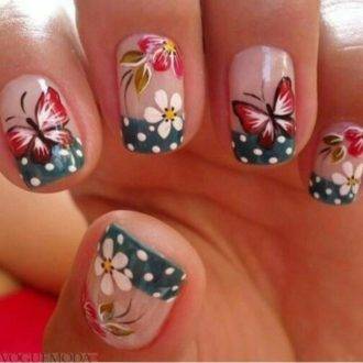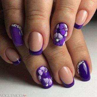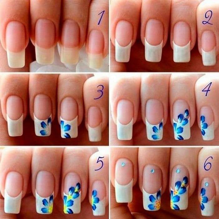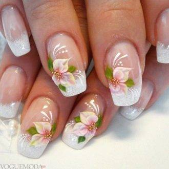 Также акрилом можно сделать френч и оформить его оригинальным флористическим рисунком. Техника росписи акрилом удобна тем, что если узор не получился, то его можно просто смыть водой, пока он не засох и начать роспись сначала.