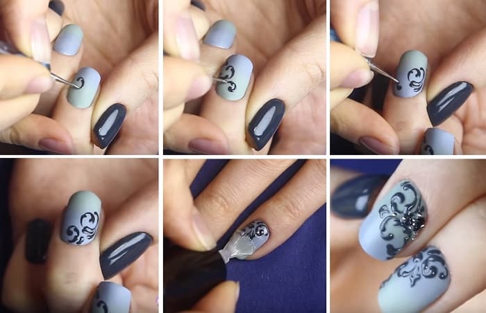 Как и в предыдущих способах декорирования, на ногти нужно нанести основной цвет, а уже после его полного высыхания наносить рисунок. Маникюр будет служить дольше, если покрыть полученный результат закрепителем.