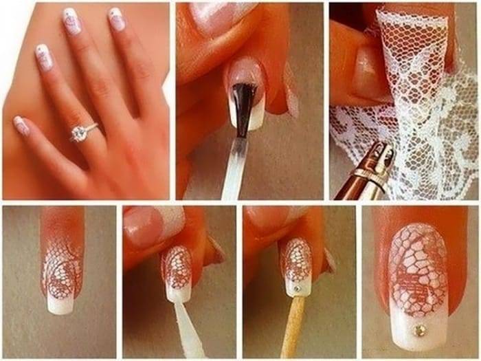 Необычный маникюр может получится, если воспользоваться простым тюлем. Здесь можно использовать разноцветные лаки для основы и узора. Нежный эффект получится, если воспользоваться светлым лаком.