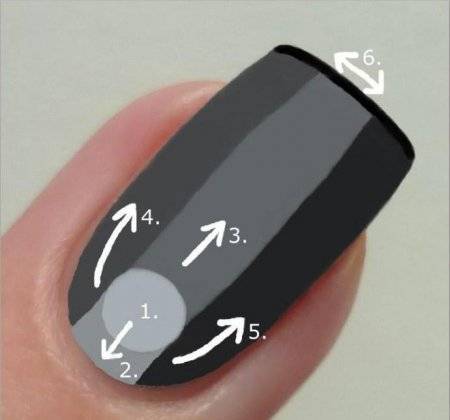 | Градиент | Нейл-арт, создаваемый с помощью губки. Характеризуется плавным цветовым (или оттеночным) переходом с четкими (или размытыми) границами воспроизводимым в пределах одного ногтя. Виды: 1.Вертикальный – состоит в нанесении разнообразных цветных полосок различных оттенков одного цвета. 2. Горизонтальный – создается спонжем, на которой наносятся два сочетаемых цвета (или оттенки одной гаммы). Разноцветные гель лаки смешиваются на палитре, при помощи зубочистки убираются цветные переходы, далее созданная масса переносится на ноготь поролоновой губкой. 3. Горизонтальный омбре, выполненный в пределах одной руки – представляет собой нанесение различных оттенков одной цветовой гаммы на разные пальцы кисти. Эффект омбре виден только при соединении всех ногтей. |