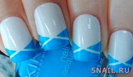 - Коричневый с голубым – хороший двухцветный маникюр для офисного варианта. Сами по себе коричневые ногти выглядят скучно, неинтересно. А голубая «улыбка» разбавляет образ, придает ему изюминки.