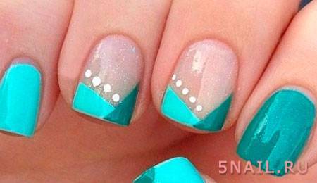 - Бледно-розовый с бирюзовым – скромный двухцветный вариант. Нежный розовый цвет используется для камуфляжа, делает пальчики привлекательными, эстетичными. А бирюзовые полосы на кончиках делают образ оживленным. Такой двухцветный маникюр хорошо будет сочетаться с летним платьем или легкой блузой.