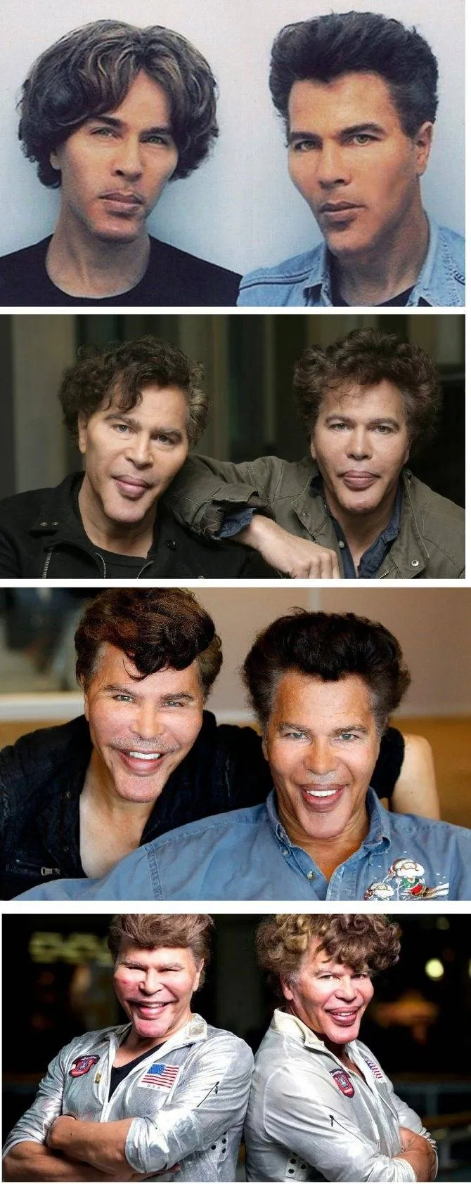 После устранения морщин и мелких линий братья решили «поработать» над формой своих скул и губ. Сильно впалые скулы и аномально высокие скулы предполагают удаление опухолей бихетте (жира на щеках) и контурную пластику силиконовым филлером (который отличается от гиалурона тем, что остается в тканях на всю жизнь).