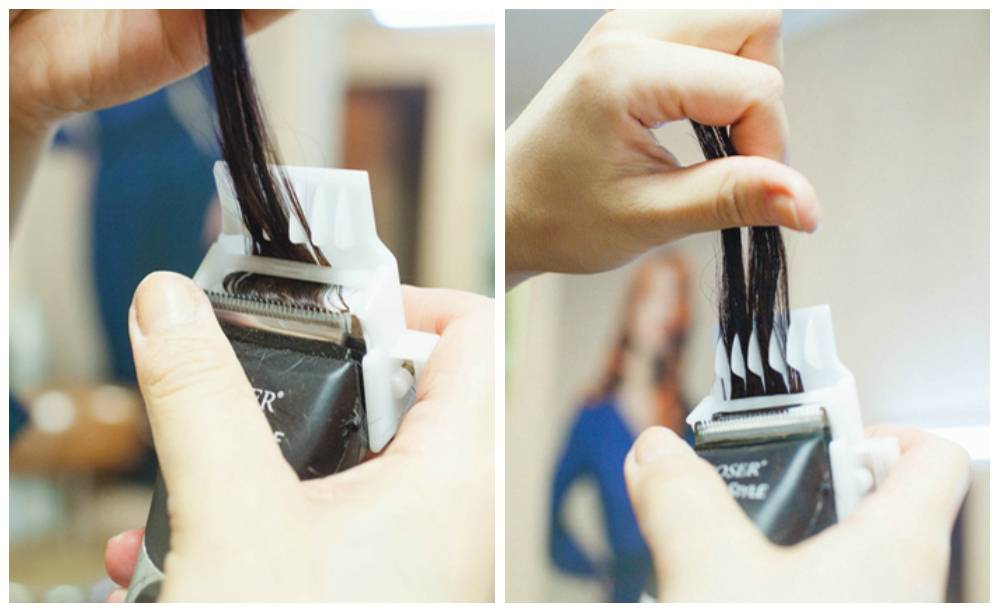 В машинку поочередно помещают прядь волос и двигают машинкой в разных направлениях.