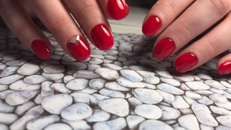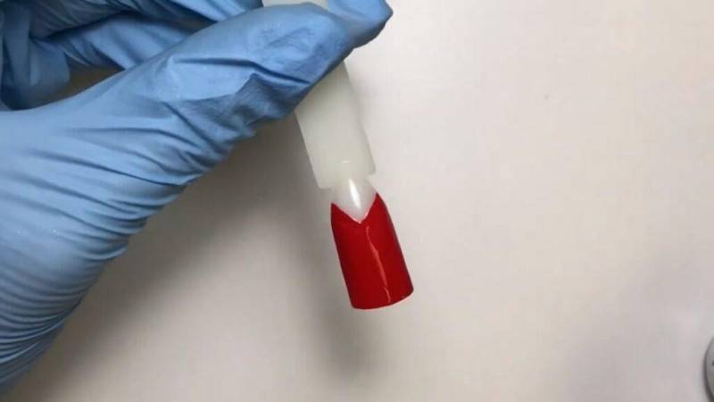 На одном или нескольких ногтях красным лаком наносят две пересекающиеся линии, которые формируют пустой треугольник у лунки.