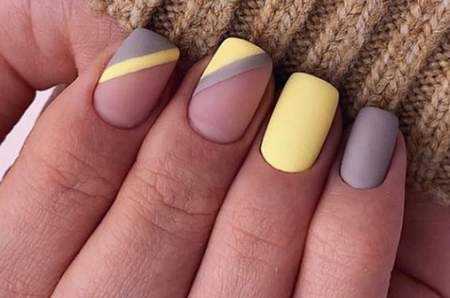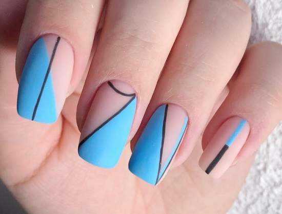 Еще один популярный маникюр 2020 с полосками – это геометрические рисунки. Для их создания необходимо расположить полосы так, чтобы они перекрещивались. При этом зачастую получившиеся сегменты окрашивают в разные цвета.