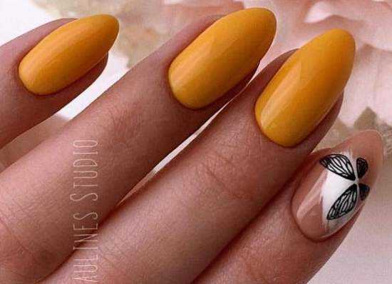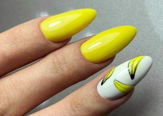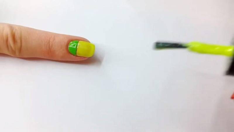 Вторую часть ногтевой пластины закрашивают жёлтым цветом так, чтобы между покрытиями осталась тонкая не покрашенная полоса.