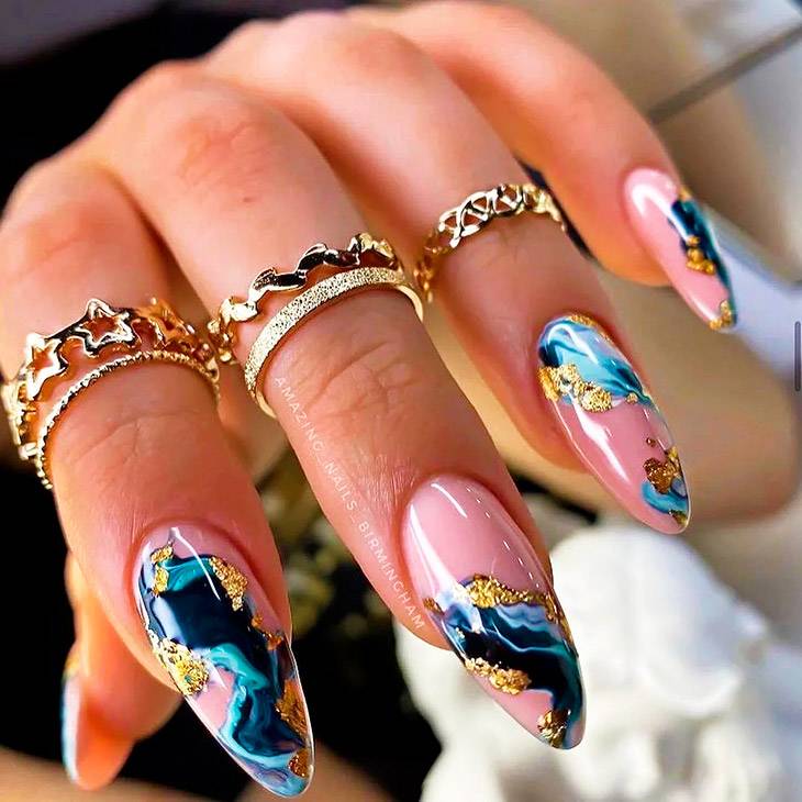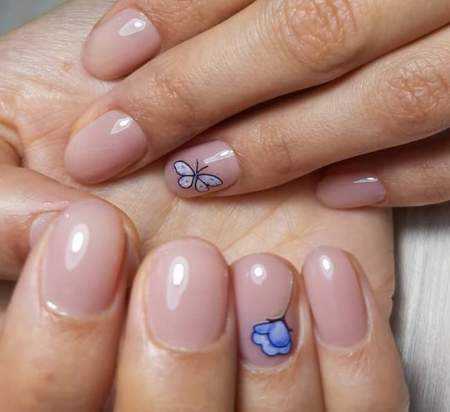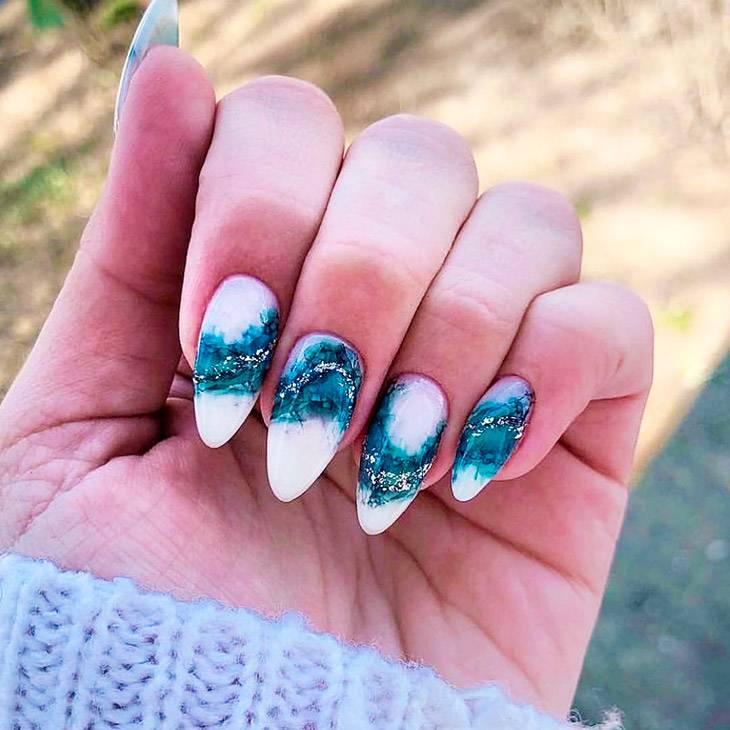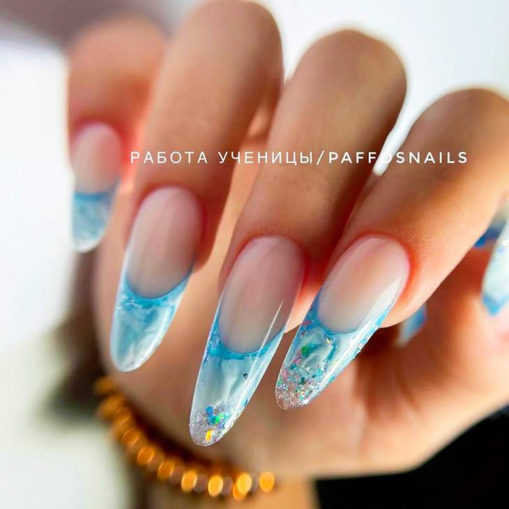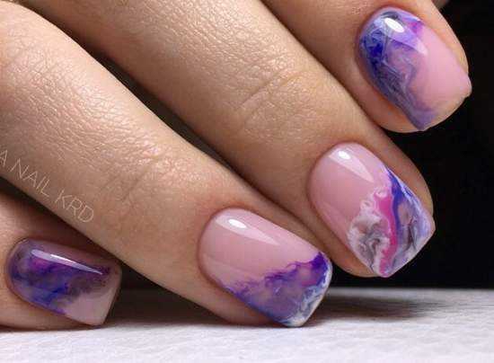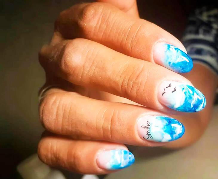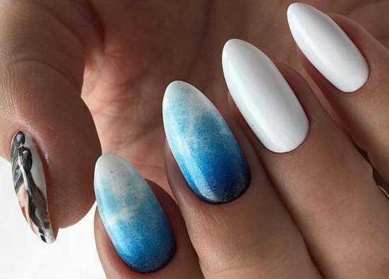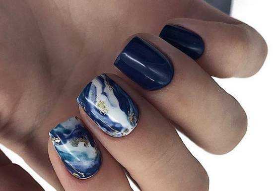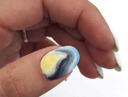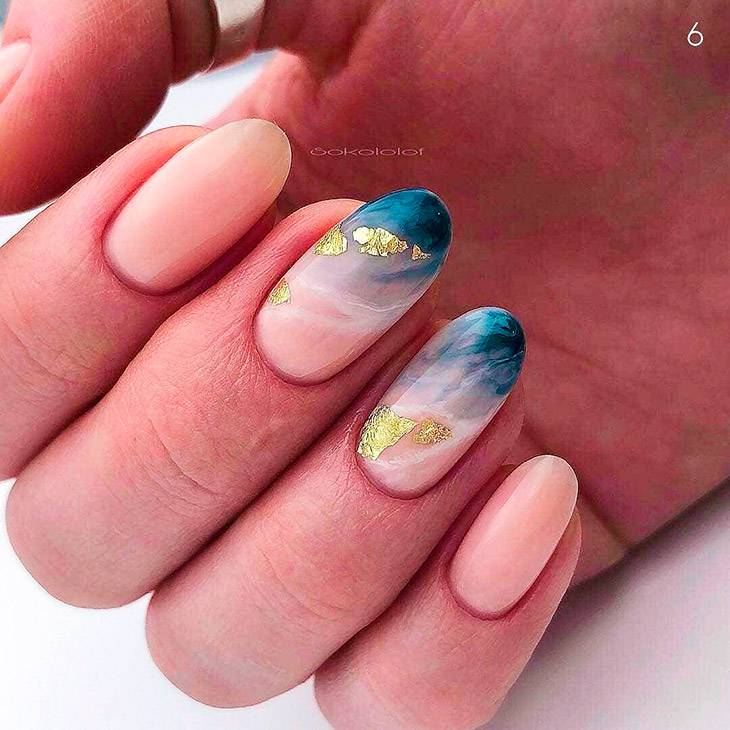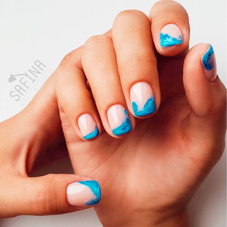 Еще одним вариантом столь неординарного подхода к маникюру является полупрозрачный волнистый дизайн с размытым эффектом и мраморными разводами. Сине-прозрачное омбре, голубое покрытие на нескольких ноготках с элементами декора – все эти варианты интересны любительницам смелых решений.