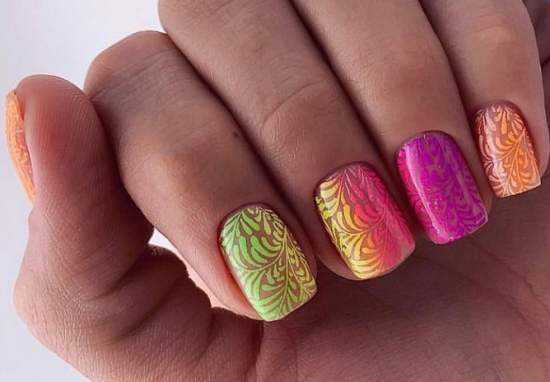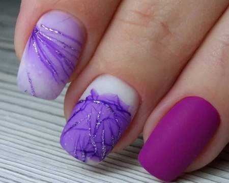 Получить необычные формы и узоры можно с помощью техники «Вуаль». Летний дизайн ногтей позволяет использовать яркие оттенки гель-лаков как для подложки, так и для самой вуали. Красиво сочетается розовая, сиреневая, синяя вуаль с белым, светло-розовым и персиковым цветом фона.