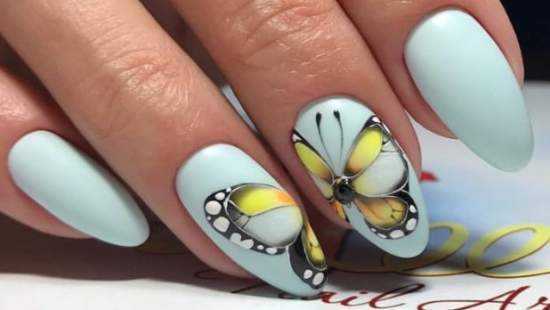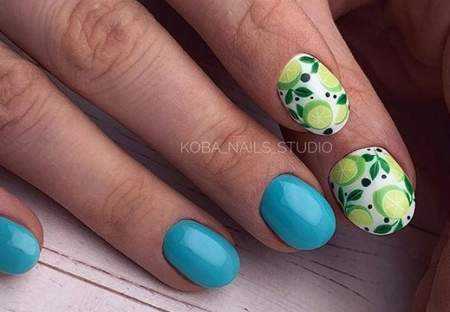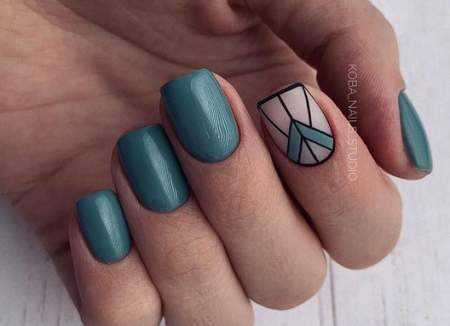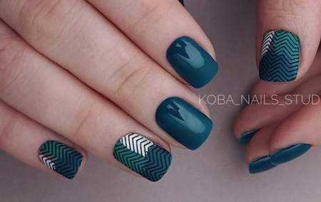 Используют цвет морской волны, как для основы, так и для нанесения рисунка. Модные тенденции допускают в одном дизайне френч и лунное оформление (лунки). Маникюр выглядит стильно, современно и дает возможность комбинировать разные оттенки.