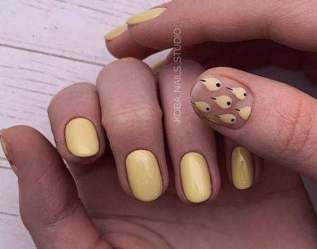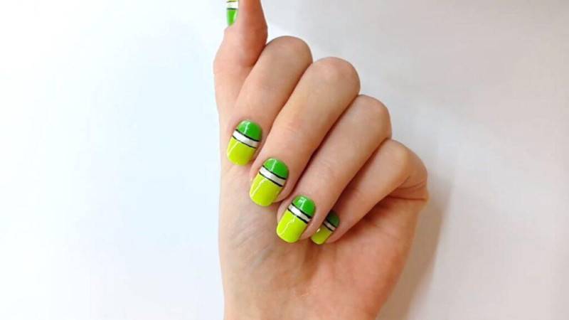 Летний маникюр в ярких жёлто-зелёных тонах с разделителем делают с применением таких расходных материалов: