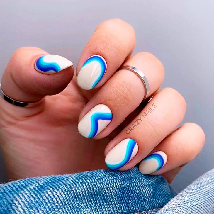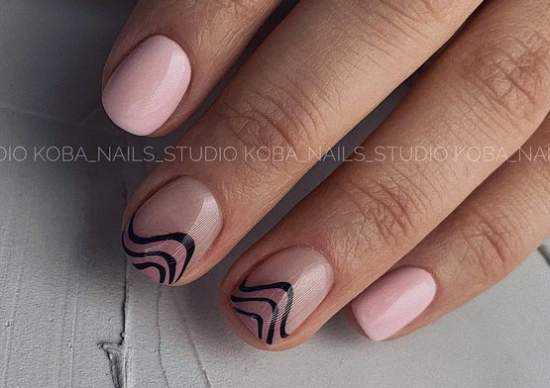 Квадрат с мягкими углами характерен для коротких ногтей, поэтому волны в дизайне следует располагать так, чтобы зрительно удлинить ногтевую пластину с помощью маникюра. Например, нарисовать вертикальные линии паутинкой с металлическим блеском или шиммерным лаком контрастного оттенка.
