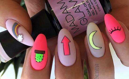 Популярный тренд – рисунки в стиле поп-арт. При наличии художественных навыков можно создать неповторимые шедевры на ногтях