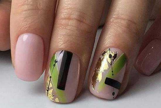 Фото готового дизайна маникюра с полосками-лентами из фольги