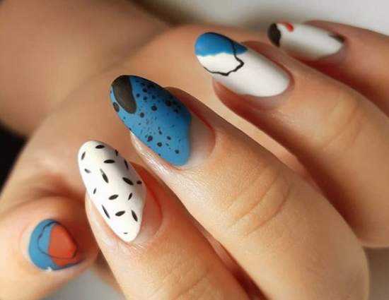 Абстрактный дизайн не сдает своих позиций. Такой маникюр всегда будет неповторимым. Даже если прийти к мастеру с конкретной идеей, повторить результат точь-в-точь с абстракцией получится вряд ли. Для создания маникюра можно использовать гель-лаки, краски, фольгу. Достаточно выбрать красивый оттенок гель-лака для фона, а с помощью контрастных цветов и кисти поставить на нем хаотичные разводы, мазки и кляксы.