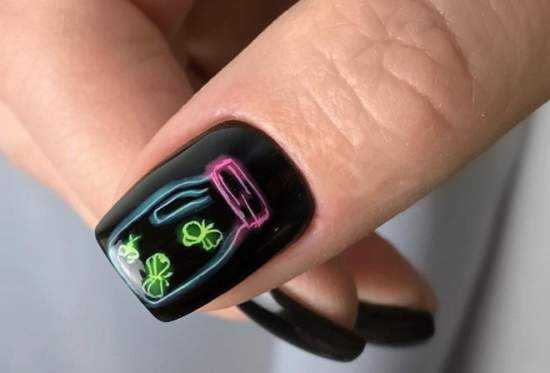 Черное золото. Еще один интересный праздничный и яркий Нейл-арт. Основа — черный цвет и золото. Элегантно и экстравагантно. Идеально для длинных или квадратных с закругленными кончиками. Такой вариант трендовых ногтей не нуждается в дополнительных украшениях. Хорошо подходит для создания вечернего образа.