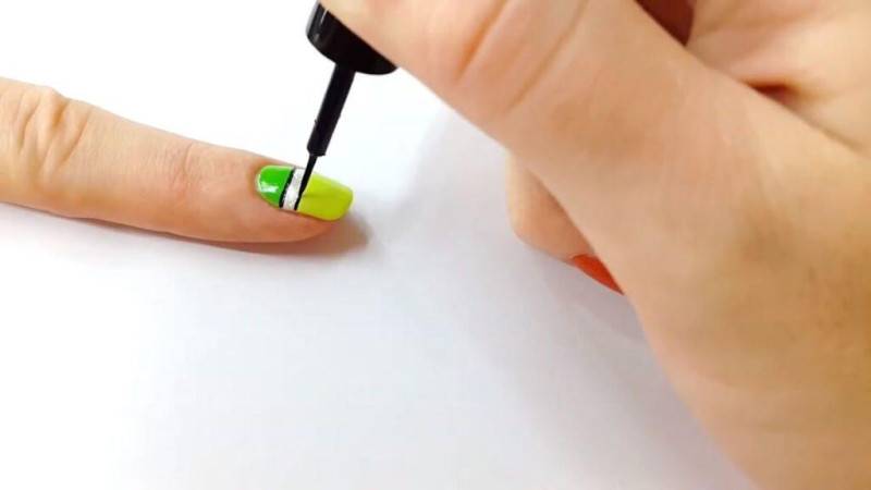 Рисуют горизонтальную линию-разделитель, причём она может располагаться в любой части ногтя (необязательно посередине).