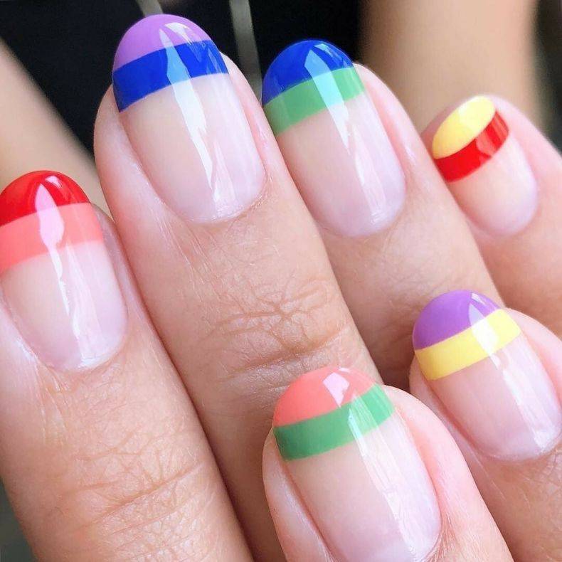 Цветными полосками, изгиб которых повторят изгиб края ногтя, можно оформить френч в виде радуги.