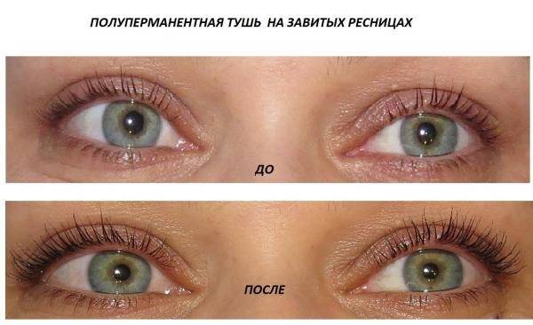 Эффект от покрытия полуперманентной тушью похож на обычное окрашивание. В некоторых случаях она похожа на традиционную, но, согласно обещаниям производителя, такая тушь держится на ресницах до 3-4 недель при аккуратном уходе.