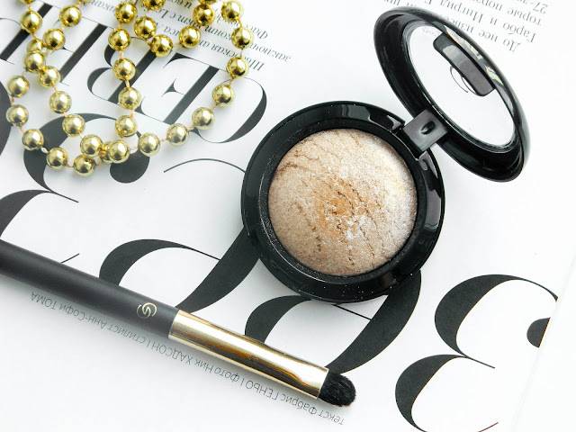 Всего в коллекции 5 цветов. У меня оттенок “Золотой шелк”, который как оказалось, является отличным хайлайтером: под бровь и в уголки глаз, можно над губой слегка пройтись кистью. Лучше тени набираются пальцем. Ели вы выберете кисть, можно наносить легкими похлопыванием, словно вбивая тени. Спонжем можете не пробовать, от слова совсем.