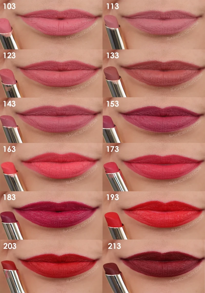 Большинство оттенков ложатся на губы как по маслу и имеют скорее кремообразную консистенцию, за исключением нескольких — в том числе 163 Coral, — которые на ощупь более жесткие, чем остальные оттенки коллекции, и немного стягивают губы.
