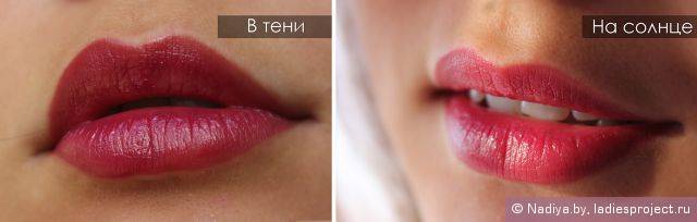 Отдельно расскажу про нанесение. Каких-то серьезных свистоплясок у зеркала помада не требует. Сначала родным аппликатором аккуратно вырисовываете контур, затем набираете еще средство и заполняете оставшуюся поверхность. Далее парочка НЕ: не пытайтесь размазать уже нанесенную на губы помаду, не смыкайте губы до высыхания. Просто подождите секунд 10-15 и тогда последующие 7 часов помада будет держаться как прибитая.